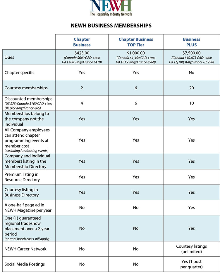 These are the perfect memberships for those businesses that have more than one employee at the same geographic location who are interested in joining the local chapter. These memberships belong to the business so if an employee leaves the company, the business can identify a new employee to take on the vacated membership. Additionally, employees of the Business member will be able to attend the primary chapter’s programming events, excluding fundraising events, at member pricing. A courtesy listing in the Business Directory and a premium listing in the NEWH Online Resource Directory, including the company’s logo, four installation images, and a link to the company website will be included with this membership.