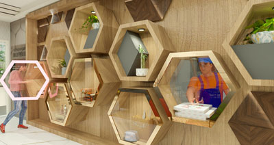 Our design requires only a smartphone with a hotel app, allowing guests to order a variety of foods, be billed, and access the honeycomb inspired delivery system with Q or bar codes.