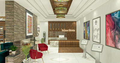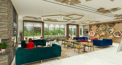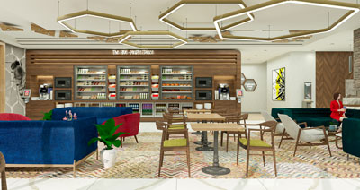 Comfortable yet flexible seating arrangements, flooring changes indicting appropriate spacing at registration, and selfâcheckâin stations complete this conceptual hotel, intended to provide each guest with a safe and unique dining experience, a regained sense of control, and a delicious familiar dinner too⊠perhaps with the hotelâs signature honey.