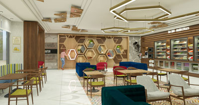 Comfortable yet flexible seating arrangements, flooring changes indicting appropriate spacing at registration, and selfâcheckâin stations complete this conceptual hotel, intended to provide each guest with a safe and unique dining experience, a regained sense of control, and a delicious familiar dinner too⊠perhaps with the hotelâs signature honey.