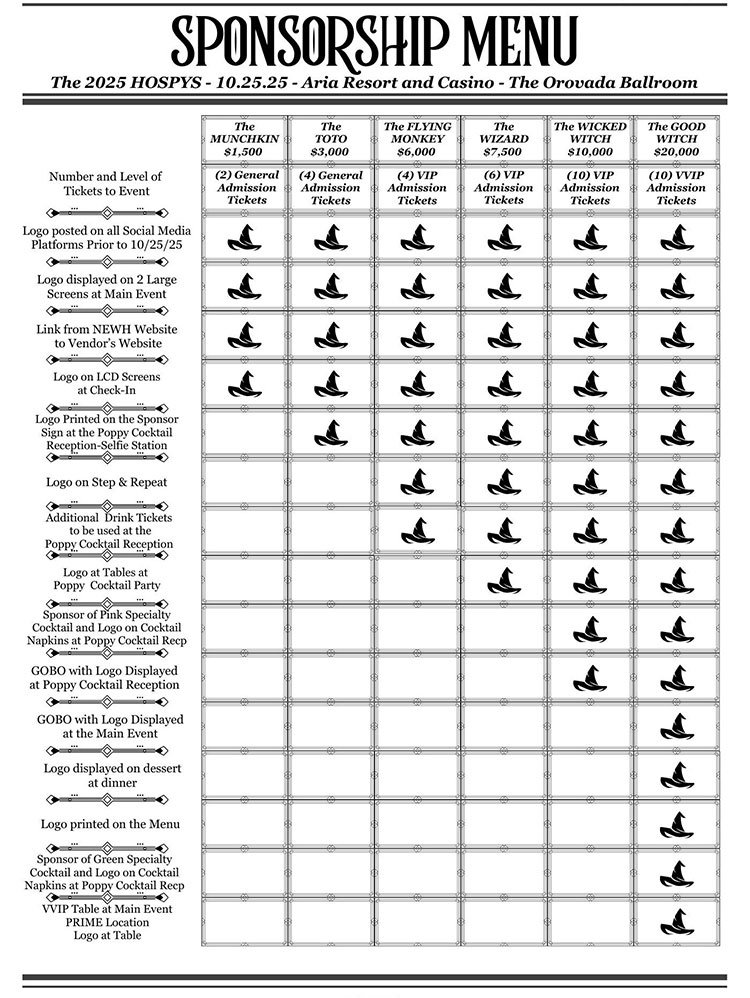 The 2025 HOSPY Awards will be presented during the NEWH Las Vegas fundraising event on Saturday, October 25th at Aria Resort and Casino.