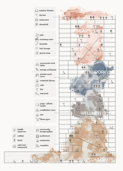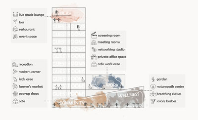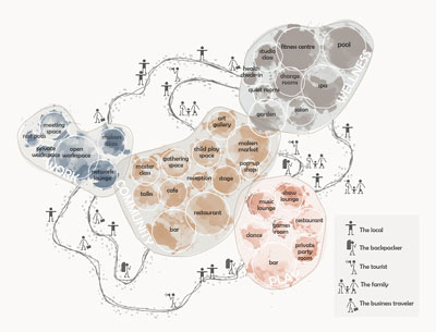 Design can help provide a renewed hotel concept emerging in conversation with the crisis and promoting a more human centric, community based sustainable experience: a synthesis of shared values in creativity and need. As a result, services and spaces would be curated by each hotel based on the local community and the traveling guest they are looking to attract. These could include pop-up shops, class spaces, communal working, digital meeting rooms, tasting stations, wellness check-in etc.