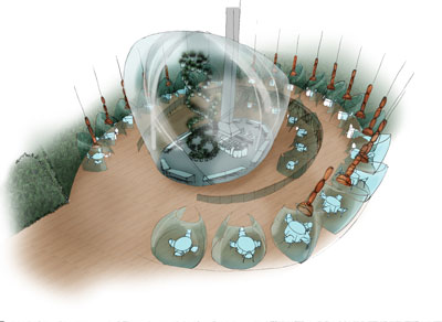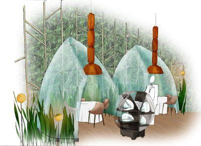 Tables are well distanced for safety and shrouded in garden pods. The design emphasizes an indoor / outdoor freshness that evokes dining al’ fresco.