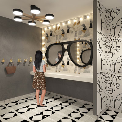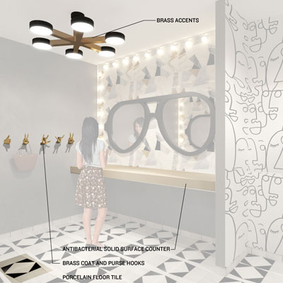 The global pandemic of Covid-19 has further instilled the human need for spaces to be both inviting and welcoming, but now with the requirement of an increased sense of safety. In designing a public restroom for a post COVID time we must focus on touchless technologies and material selections that inhibit the survivability of viruses and bacteria. The design shown features wave sensors to open the main door to the restroom and doors to the stalls. The faucets, soap dispensers, and flush valves are all touchless sensor equipped devices minimizing the reliance on physical human touch for operation. Additionally, the faucets, soap dispensers, and flush valves are made of brass which has an alloy content that is naturally antimicrobial. The glazing on the chinaware selected for the space also contains an enhanced coating minimizing the capability of molds, mildews, and bacteria from growing. Creating visual