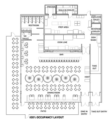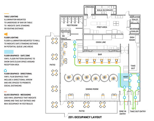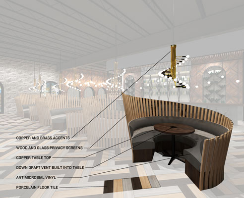 People dine out at restaurants to have a pleasant and hospitable experience. The need for restaurant designs to be beautiful and functional has not and will not change in a post Covid environment. However, the design implemented needs to be flexible, so it is easily adaptable to evolving conditions as society begins to expand levels of permissible gatherings during and after the pandemic. Social distancing measures for seating arrangements can be accomplished a couple of different ways. One way to achieve separation is through physical but decorative screens, and another way is through the use of flexible loose tables and chairs which can be stored and added back to the space as occupancy percentages fluctuate. The plans demonstrate a 20% occupancy layout along with a 100% full occupancy layout. The layout features flow graphics showing how diners interact within the space. To minimize any unnecessary physical interaction, the design includes two separate entrances: one for takeout and one for dining in. The built-in booth seating in the center of the space has a few unique features that help ensure diner’s safety. The circular wood and glass screen coming from the back of the booths allows the booths to be placed next to each other but maintain an established barrier between parties. Another feature at each booth is the down draft vent system built into the table. This technology is already in use at fondue restaurants and residential cooktops to help ventilate the cooking. By utilizing this technology here we can provide a point source negative pressure system at the table minimizing the spread of airborne viruses. The tabletop and bar top is made of hammered copper which has an alloy content that makes it a naturally antimicrobial. The booth backs and cushions also feature an antimicrobial vinyl upholstery that is both durable and easy to clean. The utilization of specialized UV lighting within the space kills viruses within the air. Through a layered approach of material selection, mechanical systems, and adaptive seating the new restaurant design presents a beautiful but safe space.