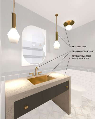 reducing and all with the added benefit of being antimicrobial. The metal accents throughout the room and in the bathroom are made of brass which is also a naturally occurring antimicrobial surface. This metal is used throughout the space on frequently touched surfaces such as faucets, shower valves, the hand shower and even on the drawer pulls of the dresser and vanity. The bathroom vanity also features the same solid surface material used in the guestroom, along with a non-porous flooring and wall tile allowing easy cleaning and the durability to stand up to inevitable chemical use. Within both the bathroom and guest space the utilization of incorporated specialized UV lighting consistently sterilizes the air while in use. This feature provides guests with an increased level of safety from hotel staff and previous guests. By implementing a layered approach to design through materials and technologies, this space addresses the needs of hotel guests, hotel owners, and hotel employees during the pandemic and beyond.