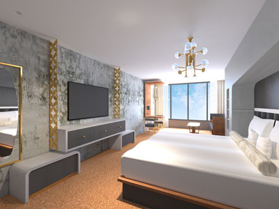 The guestroom design is sleek and inviting incorporating innovative materials and technologies into the space. It is important to select and utilize materials that have natural antimicrobial properties as these spaces are tactile and the user will come in to contact with all surfaces within the room repeatedly. The guestroom features a large solid surface unit comprised of a headboard niche, desk, bed side tables and incorporated shelving unit. The solid surface material used at this location is a unique product made from natural stone with no pores and antibacterial properties. This material is also utilized on the dresser, coffee tabletop, and accessory ottomans. By repeating the use of solid surface throughout the space we are enabling housekeeping staff to have a durable and easily cleanable surface to work with, that is also luxurious to the guest. All the upholstered surfaces including: the headboard, settee and chairs feature an antimicrobial vinyl. The strategic flooring selection of cork is soft underfoot, sound dampening, environmentally friendly, allergen