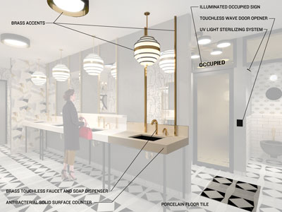 The global pandemic of Covid-19 has further instilled the human need for spaces to be both inviting and welcoming, but now with the requirement of an increased sense of safety. In designing a public restroom for a post COVID time we must focus on touchless technologies and material selections that inhibit the survivability of viruses and bacteria. The design shown features wave sensors to open the main door to the restroom and doors to the stalls. The faucets, soap dispensers, and flush valves are all touchless sensor equipped devices minimizing the reliance on physical human touch for operation. Additionally, the faucets, soap dispensers, and flush valves are made of brass which has an alloy content that is naturally antimicrobial. The glazing on the chinaware selected for the space also contains an enhanced coating minimizing the capability of molds, mildews, and bacteria from growing. Creating visual