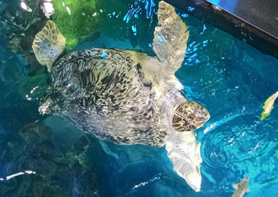 Myrtle in her eighties no longer faces the perils of today’s oceans and she gets fed daily; in fact, she gets fed first because she hounds the aquarium divers otherwise. And nowadays she circles the glass enclosure carefree, rests without fear, and monitors the passersby unfazed. Likely she doesn’t know that her former habitat is warming and rising or that her natural food source is dwindling. Possibly, she is unaware that coral reefs are dying worldwide, and that plastic pellets are as common as sand on the ocean floor. Maybe she knows that her daily visitors represent a species that has reached seven billion and has reshaped the planet’s landscape permanently. I’m sure Myrtle would accept freedom willingly but she has been forced into retirement like we all will be someday. In her sagacity as an elder sea-surfer, Myrtle has a lot to say to us on the outside. And I can see it in her eyes as she floats along the glass one last time: Just keep paddling on.