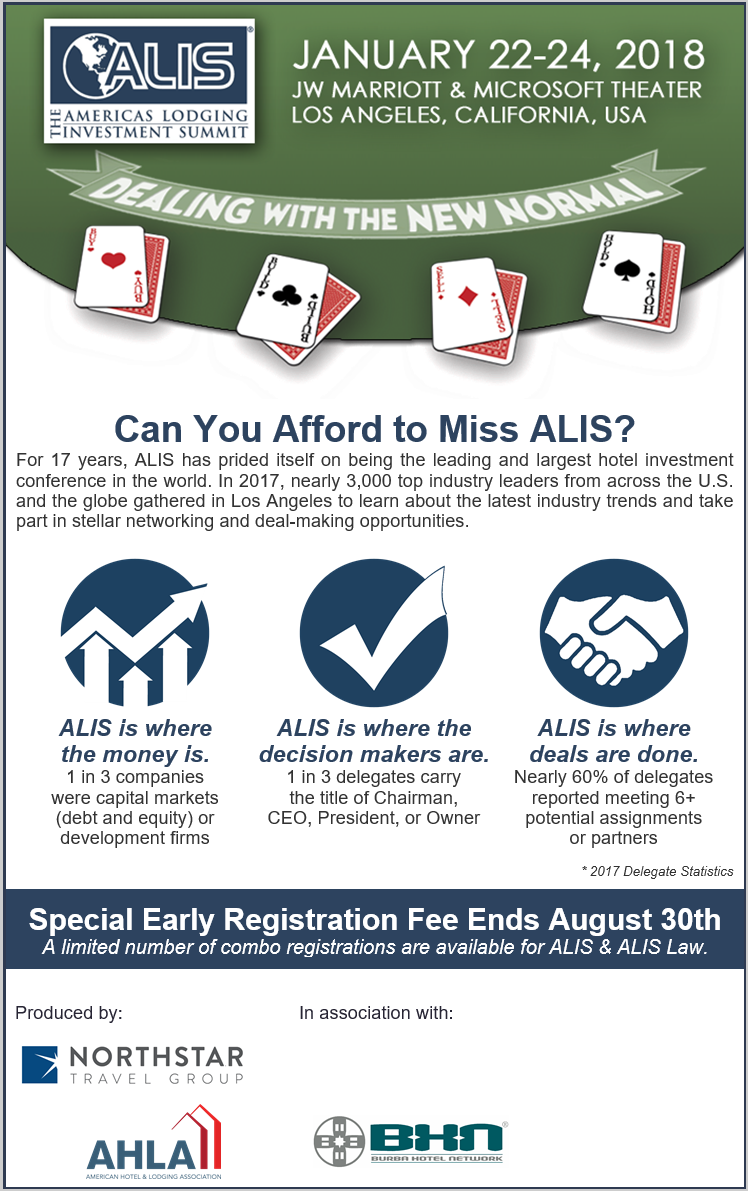 ALIS – The Americas Lodging Investment Summit Start: Monday, January 22, 2018 End: Wednesday, January 24, 2018 Venue: JW Marriott & Microsoft Theater Address: Los Angeles, CA Map