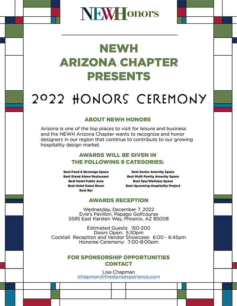 NEWH Arizona would like to celebrate this evening of greatness by honoring the organizations that create the best hospitality spaces in the valley. The following categories will be honored: