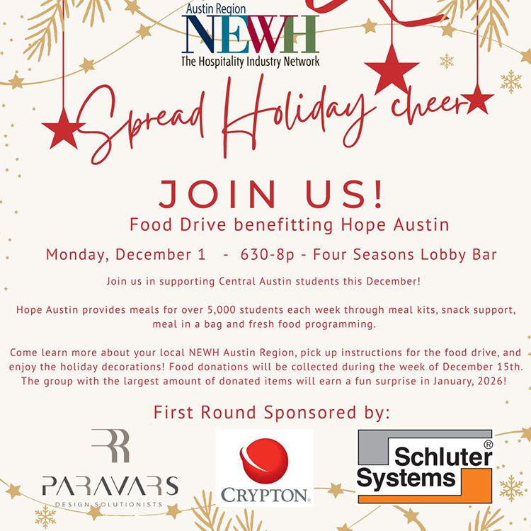 Come learn more about your local NEWH Austin Region, pick up instructions for the food drive, and start collecting! Food donations will be collected during the week of December 15th. The group with the largest amount of donated items will earn a fun surprise in January, 2026!