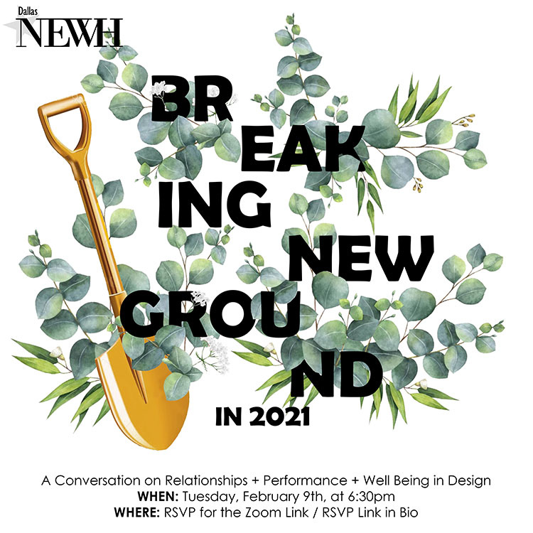 Dallas NEWH Breaking New Ground Event Start: Tuesday, February 9, 2021 6:30 pm CST End: Tuesday, February 9, 2021 7:30 pm CST Venue: Virtual Event Click here to Register today!