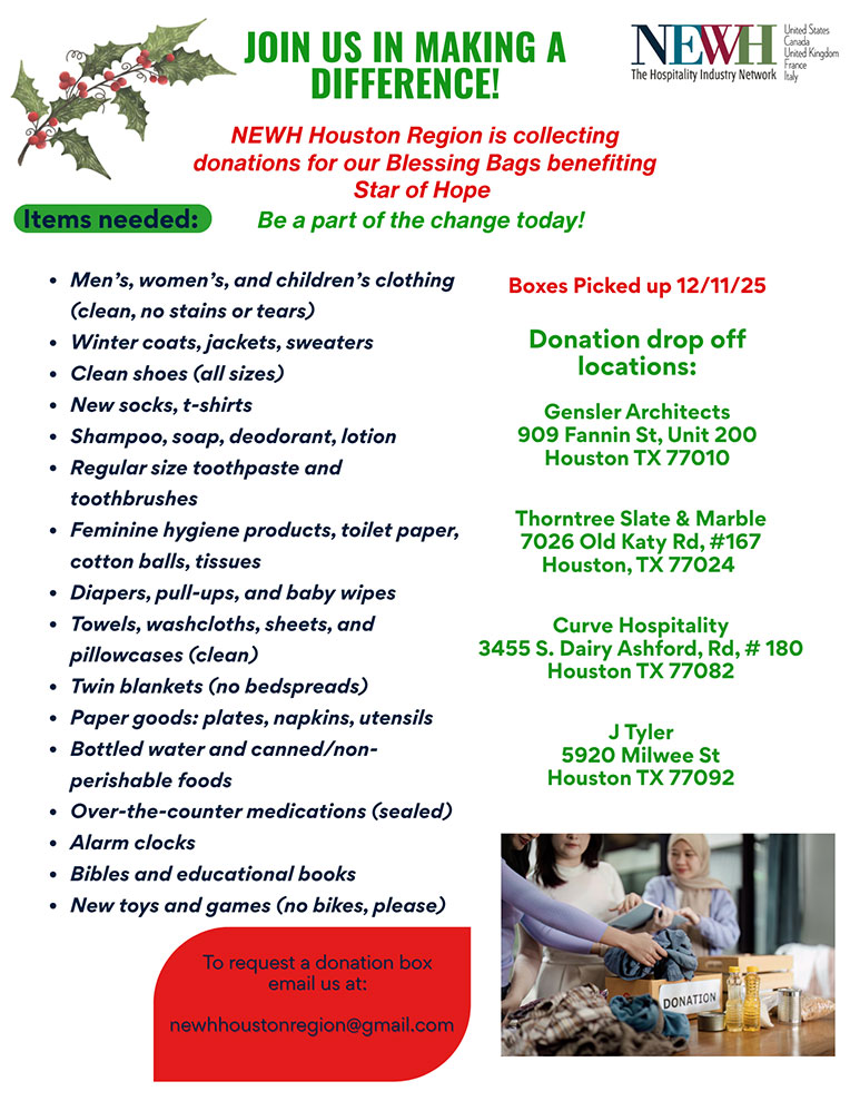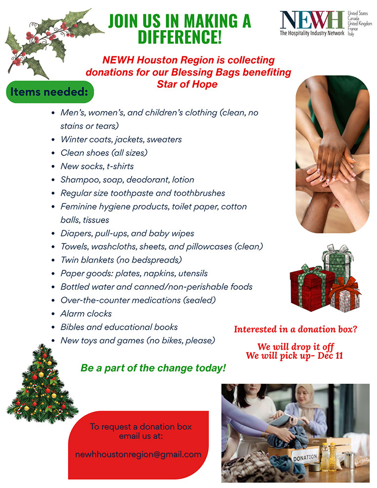 Houston Region NEWH Community Service Start: Thursday, December 11, 2025 End: Thursday, December 11, 2025 Blessing Bag Drive benefiting Star of Hope – to be picked up on December 11th Interested in a donation box? Email us!