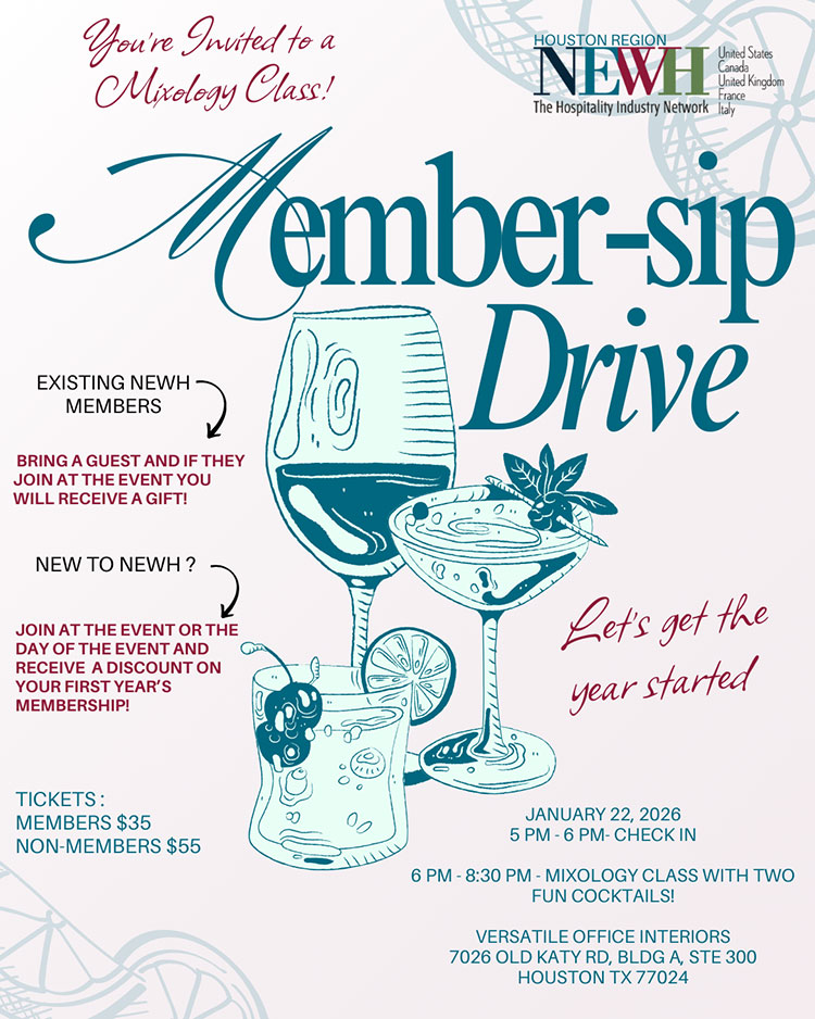 NEWH/Houston Region and NEWH, Inc. invite you to attend this event solely at your own risk. Measures will be taken to comply with all applicable health and safety directives, but by attending the event you assume any and all risks associated with your attendance, including without limitation, exposure to the COVID-19 and other health and safety risks.