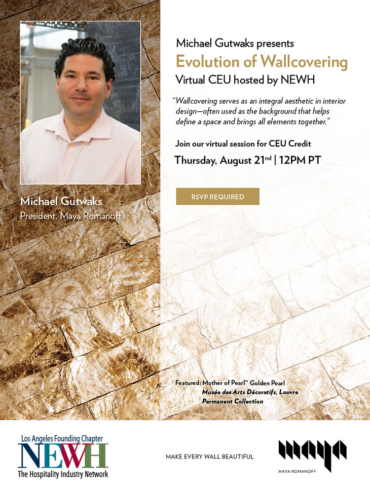Summary of CEU: Wallcovering serves as an integral aesthetic in interior design–often used as the background that helps define a space and brings all of the other elements together. Maya Romanoff’s CEU, presented by Michael Gutwaks, explores the Evolution of Wallcovering, from its incredible history to the role it plays today and beyond!