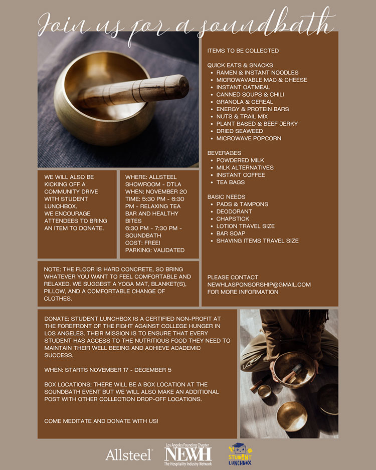 Join us for a relaxing Soundbath as the last NEWH LA Wellness event of the year! Be sure to bring a yoga mat, blanket(s), and a pillow if desired!