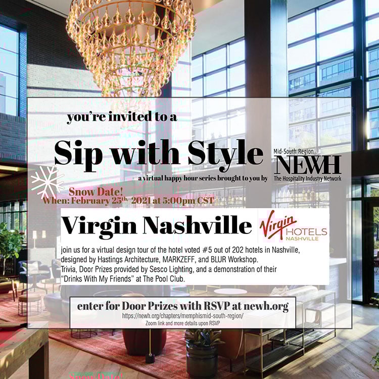 Mid-South Region NEWH Sip with Style Start: Thursday, February 25, 2021 5:00 pm CST End: Thursday, February 25, 2021 6:00 pm CST Venue: Virtual Event Click here to Register today!