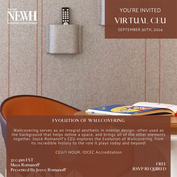 Wallcovering serves as an integral aesthetic in interior design–often used as the background that helps define a space, and brings all of the other elements together. Joyce Romanoff’s CEU explores the Evolution of Wallcovering, from its incredible history to the role it plays today and beyond!