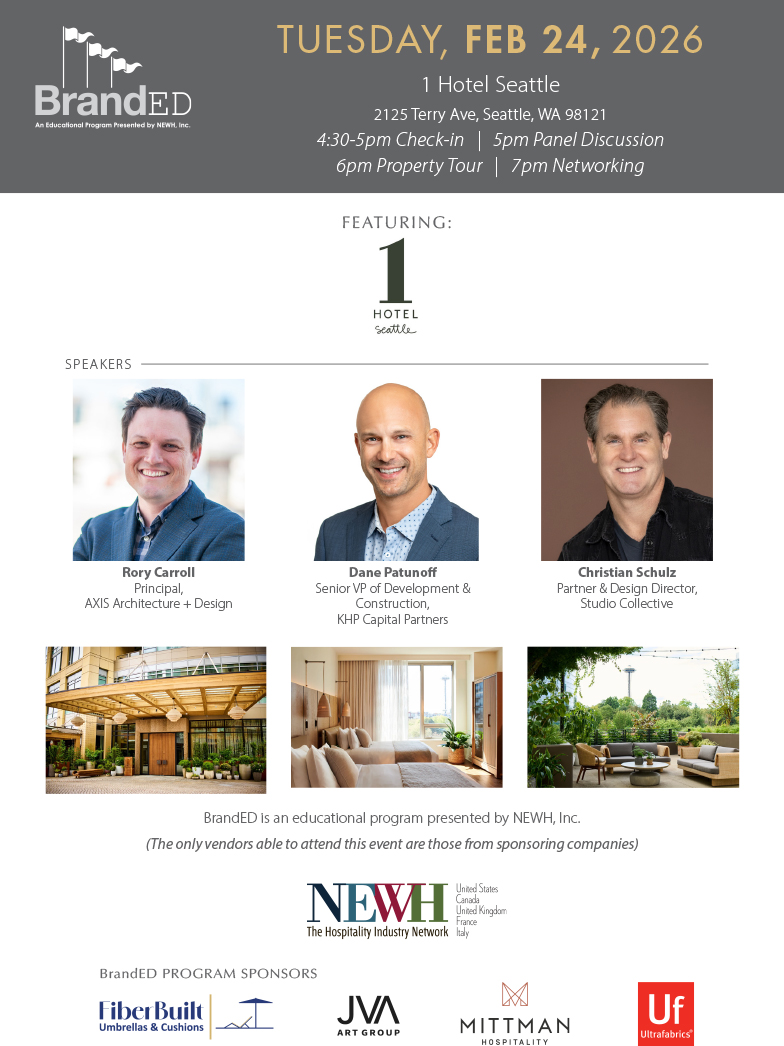 NEWH BrandED Event in Seattle Start: Tuesday, February 24, 2026 5:00 pm PST End: Tuesday, February 24, 2026 8:00 pm PST Venue: The 1 Hotel Seattle Address: 2125 Terry Ave, Seattle, WA, 98121 This event is full click here to be put on Wait List! *Apologies, the only manufacturers able to attend this event are those from sponsoring companies Map
