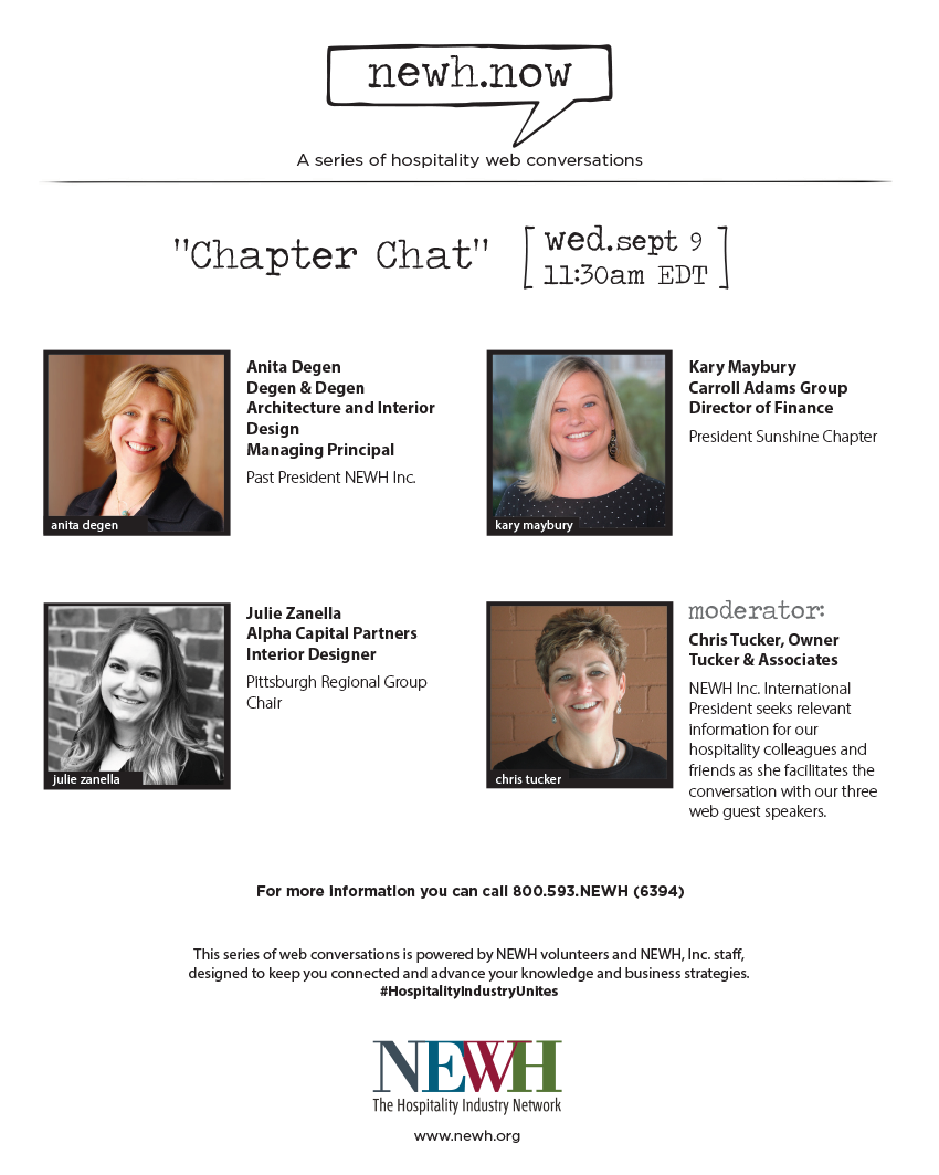 NEWH Now – Chapter Chat Start: Wednesday, September 9, 2020 11:30 am CDT End: Wednesday, September 9, 2020 12:30 pm CDT Click to register now! NOTE – this event is 11:30am EST / 10:30am CST / 8:30am PST (1 hour)