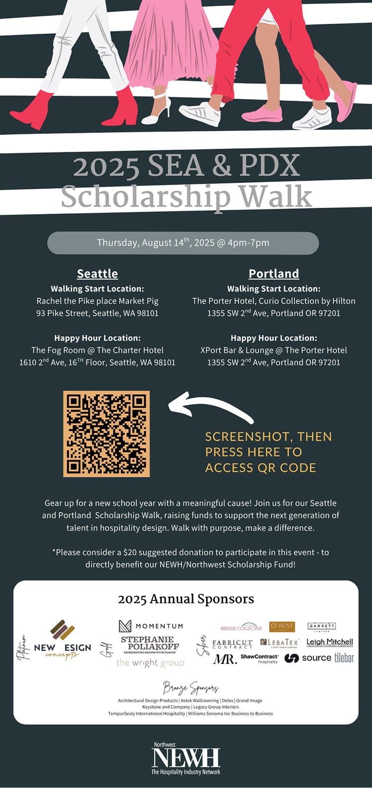 Donation: *Please consider a $20 suggested donation to participate in this event – to directly benefit our NEWH/Northwest Scholarship Fund!
