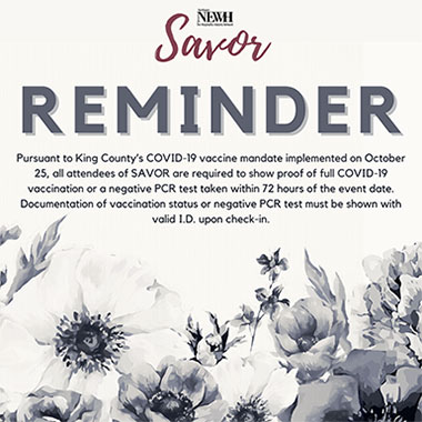 Pursuant to King County’s COVID-19 vaccine mandate implemented on October 25, all attendees of SAVOR are required to show proof of full COVID-19 vaccination or a negative PCR test taken within 72 hours of the event date. Documentation of vaccination status or negative PCR test must be shown with valid I.D. upon check-in.