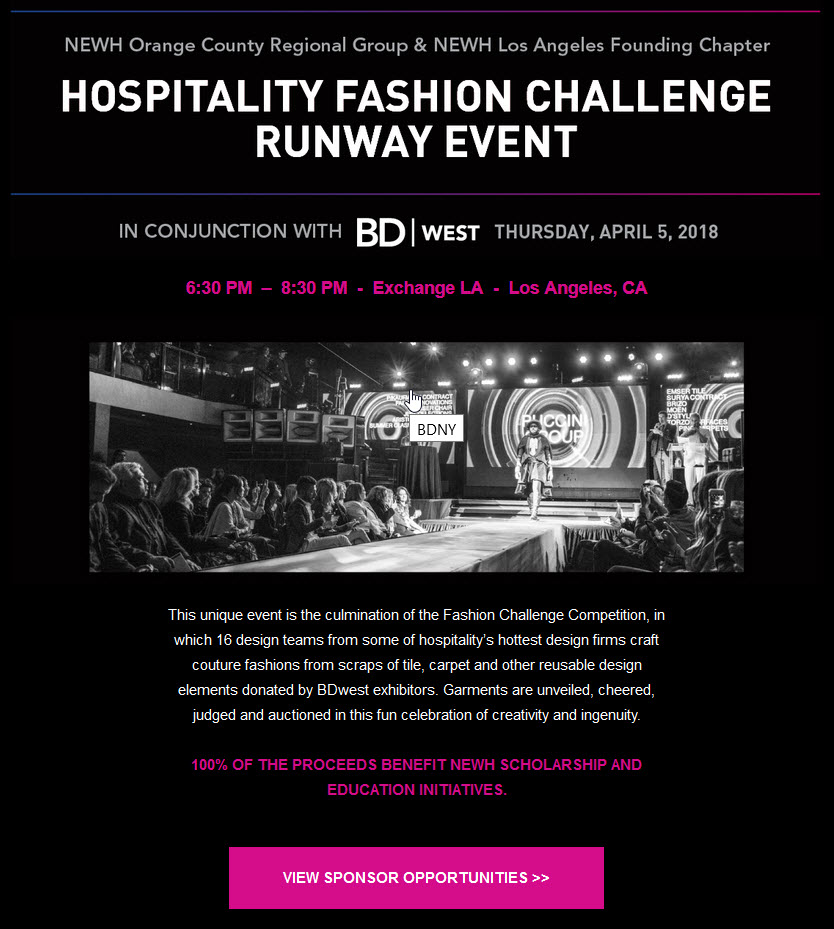 Orange County Region and Los Angeles NEWH Hospitality Fashion Runway Event Start: Thursday, April 5, 2018 6:30 pm CDT End: Thursday, April 5, 2018 8:30 pm CDT Venue: Exchange LA Address: Los Angeles, CA, USA Click here to Register now! Map
