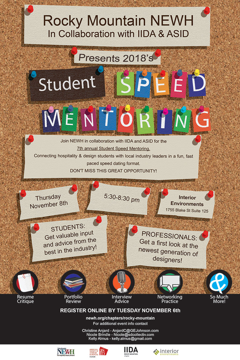Rocky Mountain NEWH Student Speed Mentoring Start: Thursday, November 8, 2018 5:30 pm CST End: Thursday, November 8, 2018 8:30 pm CST Venue: Interior Environments Address: 1755 Blake Street - Suite 125, Denver, CO, 80202 RSVP Today – click here! Map