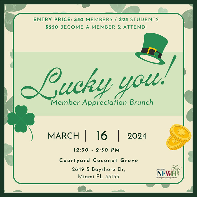 Join NEWH SF for our Annual Member Appreciation Brunch on the 20th floor of the newly renovated Courtyard Marriott Coconut Grove. Enjoy an early afternoon of brunch, mimosas and networking where we show you how “Lucky” we are to have you as a member. More information coming soon regarding an informative and inspirational panel featuring some of our TopID firms.