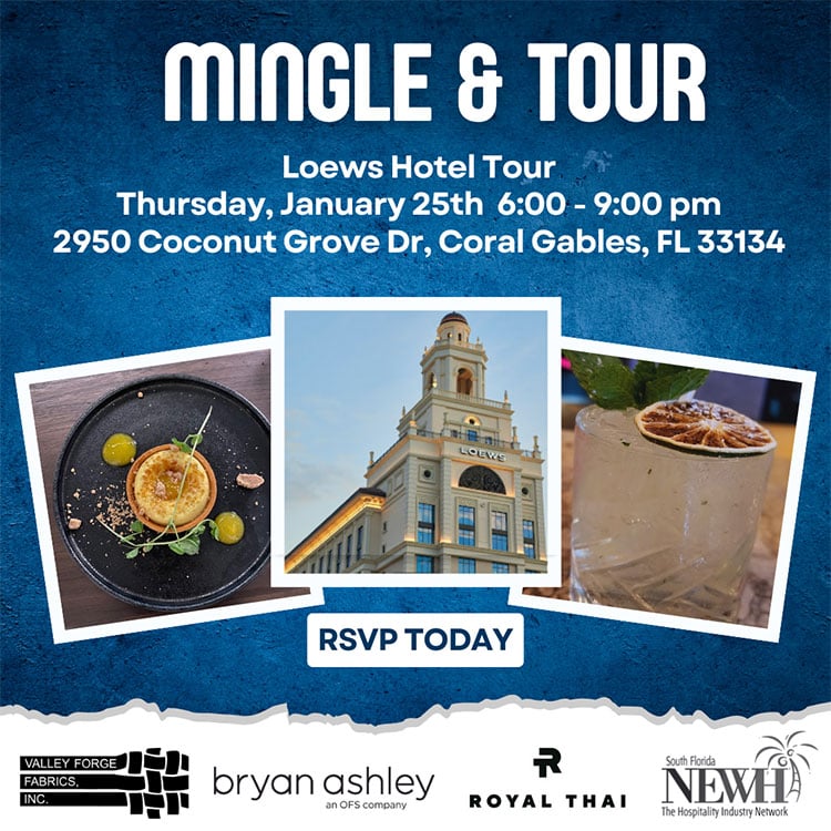 Join us on Thursday, January 25th for an NEWH South Florida monthly mingle and hotel tour at the Loews Coral Gables. Enjoy light bites and drinks courtesy of Bryan Ashley, Valley Forge and Royal Thai. There will be 2 tours offered on a first come first serve basis at 6:30 and 7:00 pm.