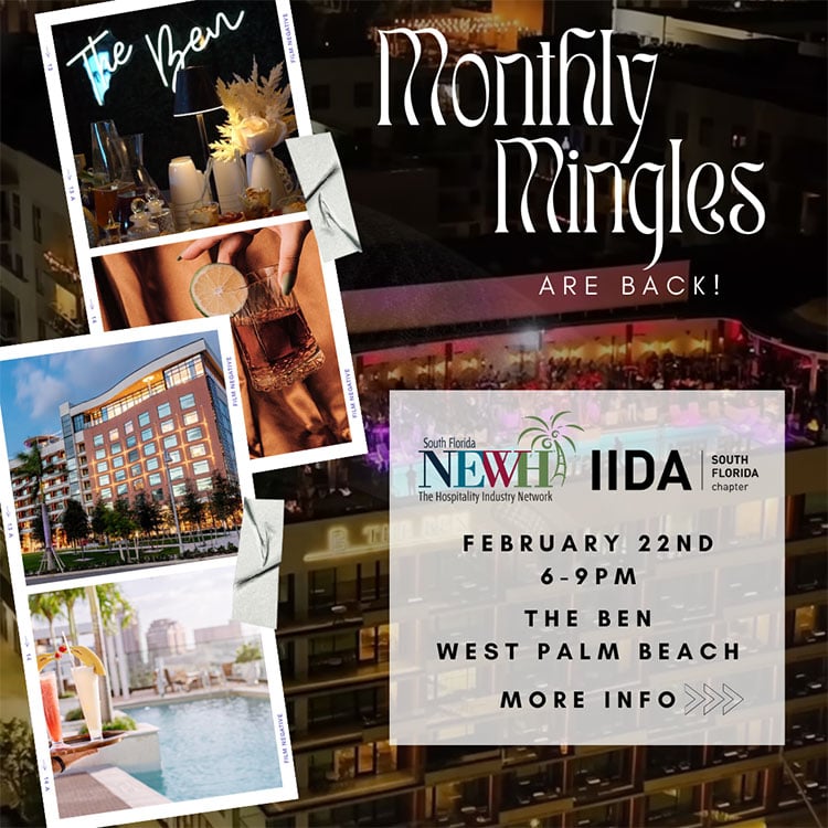 NEWH South Florida is excited to co-host our next monthly mingle with IIDA South Florida, with many thanks to our sponsors Palacek Hospitality, Kettal/Pi Fine Art, Symmetry Pointe/Parasoleil, and Tilebar. Join us on Thursday, February 22nd in West Palm Beach as we celebrate our industry at The Ben at their Spruzzo rooftop bar. This event will be free to members of either organization, but you must register with the link below. Thank you.