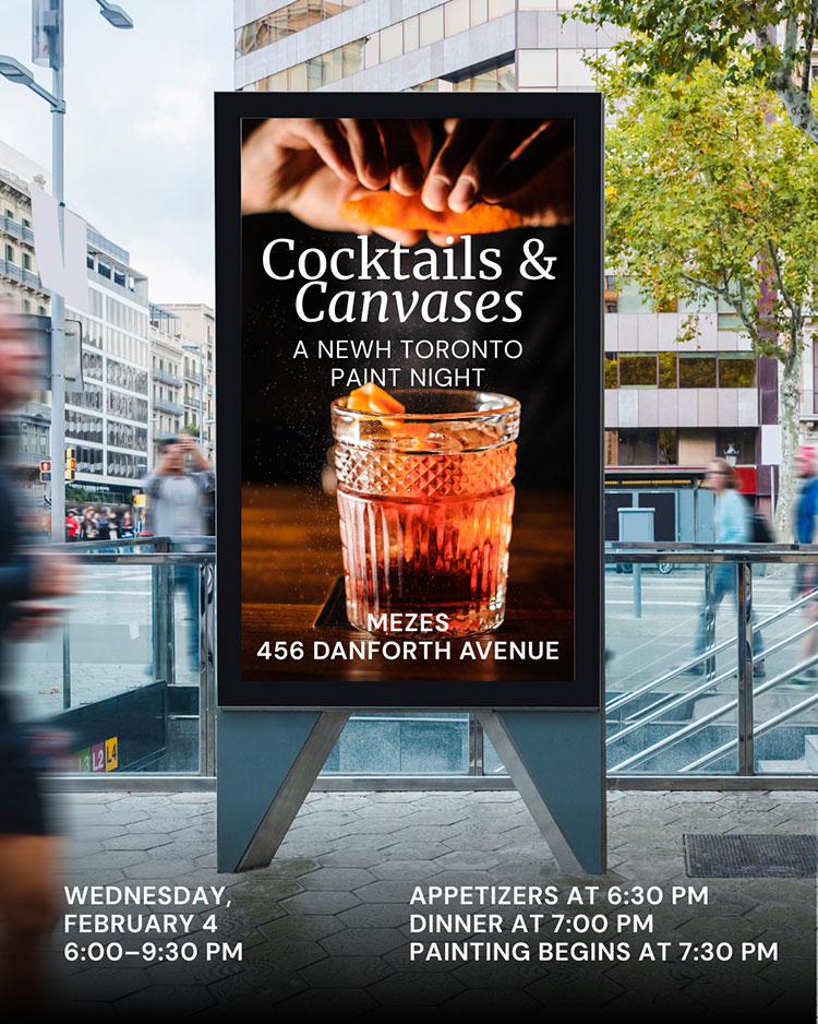 Join NEWH Toronto for an evening of creativity, connection, and community at Cocktails & Canvases. Hosted at Mezes, this social paint night includes appetizers, dinner, and guided painting instruction — no prior experience required.