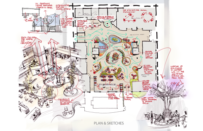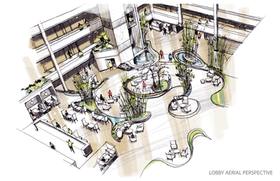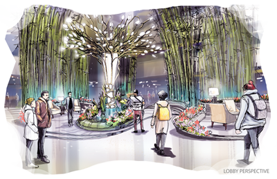 The repurposed atrium space easily allows for social distancing and immediately transports the guest into a sense of well-being through the biophilic environment. The impression of an indoor park psychologically conveys the message of distancing as people understand organic spaces. Meandering curves meaningfully direct the guest through tall bamboo âtreesâ that stretch for the sunlight and the fresh air from the operable skylights. Select water features further promote the sense of nature and serenity and add sound masking through a few select fountains and running water.