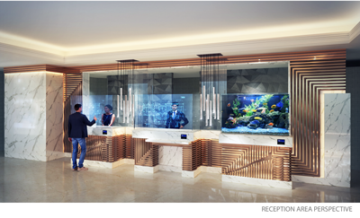 The multi-purpose reception desk has an interactive transparent glass screen that can be used for self check-in, directions, information, and navigation. When the desk is unmanned, a fun and interactive display will be projected. Contactless credit card readers are installed at the front of the desk.
