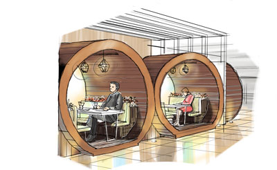 safely in the hands of the thirsty customer. To subtly separate the bar guests, a glass divider allows for groupings of 2. The dividers can be lowered to allow larger groups to sit together. In addition, the glass will be interactive where menu items can be ordered, sports updates, weather and/or the latest news can be viewed.