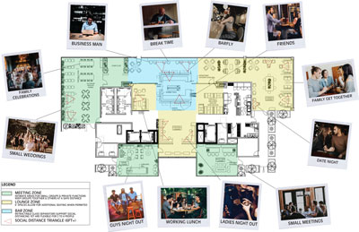 Our floor plan depicts our Room-within-a-Room⢠philosophy, which is critical today, not only for social distancing but for the security and safety of the guests and staff. As you walk through the space, you can see the fiancÊe meeting the parents of the bride for the first time; a group of guys getting together in a room to play games and watch sports; the book club that meets every month; family gatherings; the couple out for a date; the single business travelers wanting a drink while catching up on emails and the happy bar fly wanting to socialize with others.