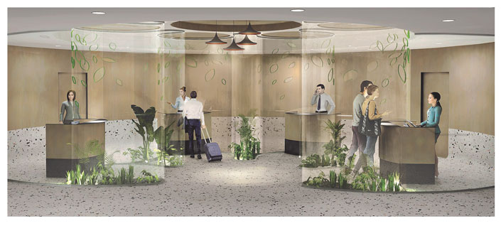The design concept is to reconfigure the typical linear setting of check-in counters to adapt to social distancing. The counters are placed in an outward circular layout, allowing guests turning different directions and walking toward distanced check-in spots that are enclosed by transparent dividers.