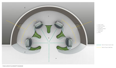 The flower like shape that is formed by curved Plexiglas panels distinguishes public versus private areas, as well as creating opportunities for placing plants between check-in counters. There are cut-outs on glass panels for voices to pass through. The foliage patterns coincide with indoor plants to bring natural elements into the space.