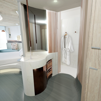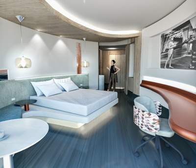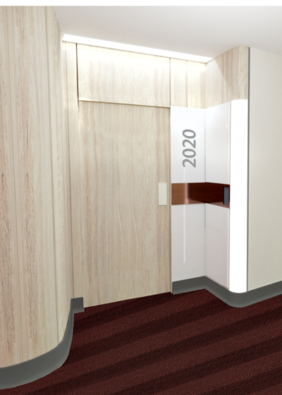 Applications of this concept include the entry module with disinfecting cove lighting, touch-free access and housekeeping notification, and amenity compartments for the exchange of linens and room service. Inside the room, a “sacred vessel” is spotlighted between the bathing and living compartments to promote regular personal care rituals. A generous wardrobe supports abundant hangers and open-webbed storage in a compartment continuously bathed in disinfecting light when closed. Sculpted ceiling and wall panels embrace guests in the living area, spacious enough for in-room fitness, then release to visual connection to the world beyond. Furniture is gracefully conjoined into perimeter power and light, complemented by minimally curated accents that provide nostalgia and delight.