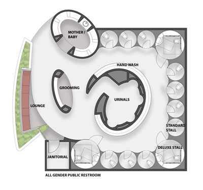 Redundant circulation, storage, and fixtures in traditional gender segregated facilities is further exacerbated by post-pandemic standards of physical separation. Segregated restrooms are the standard in the United States but are evolving with new initiatives and laws addressing universal design and inclusion, as well as the hybridization of cultures. The all-gender approach requires thoughtful planning of sight lines and access where gender-separation is required but increases efficiency for cleaning and use of other fixtures. This concept demonstrates that in the same footprint as traditional restrooms an all-gender restroom can exceed the number of fixtures plus provide improved circulation, social separation, and amenities such as mother-baby and grooming spaces. Furthermore, if all-gender restrooms become mainstream, the introduction of a waiting lounge as a more open transition area between lobbies and restrooms is an added feature.