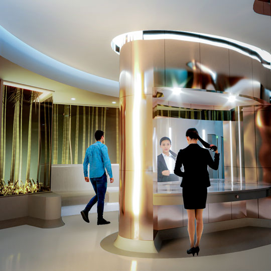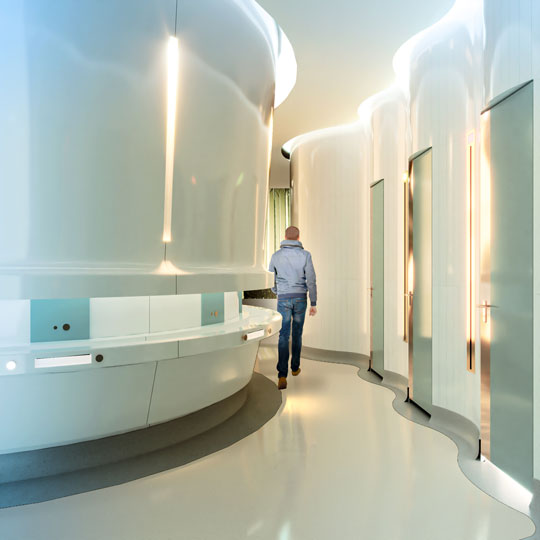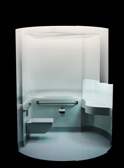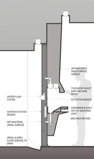 Hand washing is easily accessible, and a central feature of the space. Integration of automatic point of use water, soap and dryer with direct exhaust above each wash station minimizes the spread of air and water-borne pathogens. Inspired by self-cleaning public toilets in Europe and Asia, fully enclosed standard and deluxe toilet stalls provide privacy, accessibility, and choice for a diverse population. Prefabrication of stalls and curvilinear surfaces with antimicrobial properties promote cleanability, invisible movement of scrubbed air, and disinfecting light across edgeless forms. Occupancy sensors and notification systems improve the flow and timing of users.