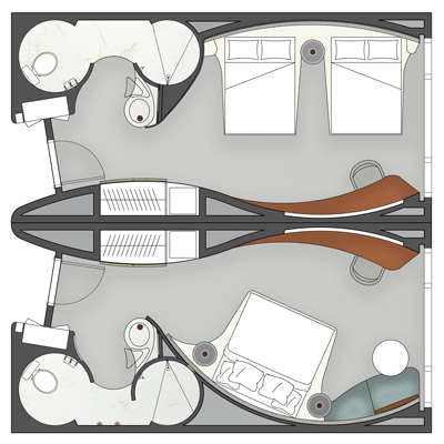 Applications of this concept include the entry module with disinfecting cove lighting, touch-free access and housekeeping notification, and amenity compartments for the exchange of linens and room service. Inside the room, a “sacred vessel” is spotlighted between the bathing and living compartments to promote regular personal care rituals. A generous wardrobe supports abundant hangers and open-webbed storage in a compartment continuously bathed in disinfecting light when closed. Sculpted ceiling and wall panels embrace guests in the living area, spacious enough for in-room fitness, then release to visual connection to the world beyond. Furniture is gracefully conjoined into perimeter power and light, complemented by minimally curated accents that provide nostalgia and delight.