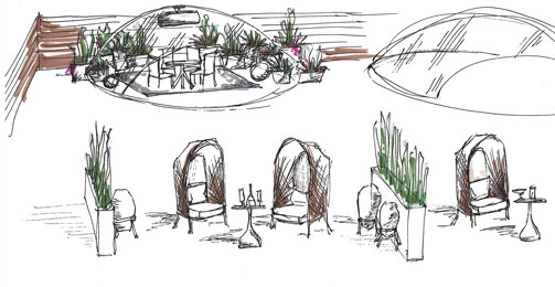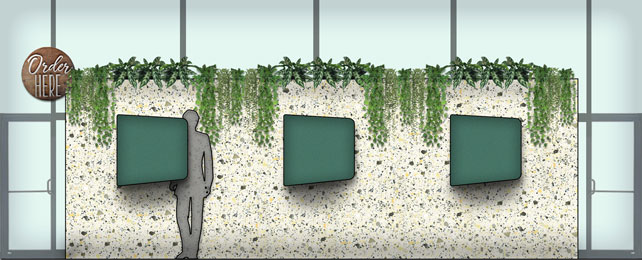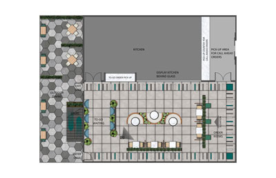Those dining-in will be required to utilize a numbered reservation system, receiving phone alerts when their table is ready (read: safe) to be seated. Guests will find QR codes custom printed on their tables for pop-up menus on individual devices, and single-use paper menus will be provided for those without mobile technology. Phone-in orders have a separate entry, minimizing gathering while waiting. Upon entry to the main dining area, walk-in to-go orders will follow an integrated path of color tile floor accents at specific intervals. These subtle visual cues allow for guests to maintain proper distance, leading them to semi-private order kiosks. The pathway then leads past the display kitchen, where guests may view food preparation and witness measures of kitchen cleanliness en route to the pick-up order station. Semi-private bench nooks with ample greenery and spacing provide a safe waiting area.
