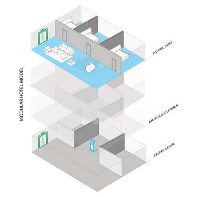 The future longevity of the hotel sector lies in its ability to scale and respond to external factors such as COVID-19. The decentralization of the traditional hotel lobby will allow hotel systems to begin operations in a more scaled approach: a hotel pod. Hotel Pods will enable brands to initially respond to COVID-19 and eventually diversify and move into markets where they would traditionally not succeed. Hotel Pods can be embedded throughout a city, adaptively reusing unoccupied floors in urban areas. Building resources and technology can be concentrated in smaller more sustainable properties. Enabling hotels to craft more personalized services. filling a market gap between renting staffed private residences and staying in unique boutique hotels.