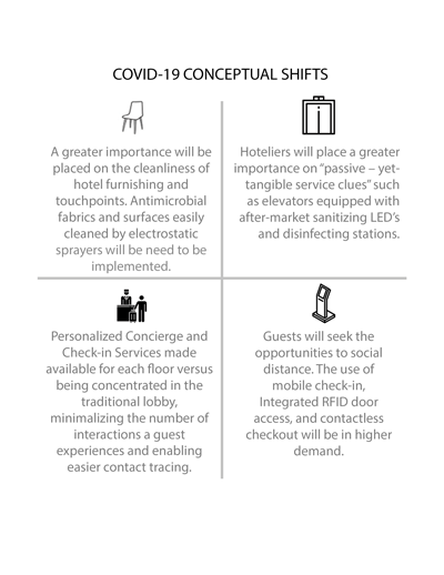 Hoteliers will place greater importance on “passive – yet- tangible service clues” such as elevators equipped with after-market sanitizing LED’s and disinfecting stations.