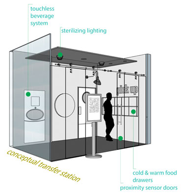 Using a fraction of the space that was once used for the on-site kitchen, a transfer station would accommodate the delivery and reception of the prepared food. On one side of the wall, the delivery driver would place the items into drawers that would maintain the desired temperature of the food, either cold or hot as needed. On the other side of the wall inside the transfer station, a staff member would retrieve the ordered items from the drawers and deliver them to the guest’s desired location. Or, if preferred the guest could receive the delivery with the use of their mobile room key, thus reducing unnecessary contact between individuals.