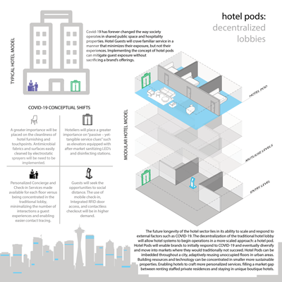 The future longevity of the hotel sector lies in its ability to scale and respond to external factors such as COVID-19. The decentralization of the traditional hotel lobby will allow hotel systems to begin operations in a more scaled approach: a hotel pod. Hotel Pods will enable brands to initially respond to COVID-19 and eventually diversify and move into markets where they would traditionally not succeed. Hotel Pods can be embedded throughout a city, adaptively reusing unoccupied floors in urban areas. Building resources and technology can be concentrated in smaller more sustainable properties. Enabling hotels to craft more personalized services. filling a market gap between renting staffed private residences and staying in unique boutique hotels.