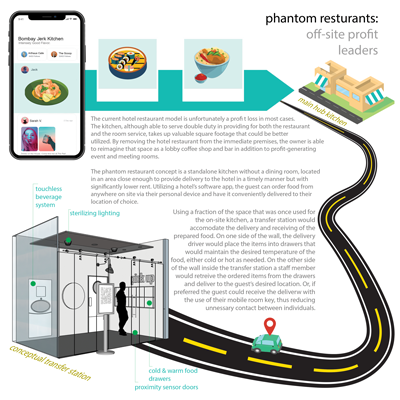 The phantom restaurant concept is a standalone kitchen without a dining room, located in an area close enough to provide delivery to the hotel in a timely manner but with significantly lower rent. Utilizing a hotel’s software app, the guest can order food from anywhere on-site via their personal device and have it conveniently delivered to their location of choice.