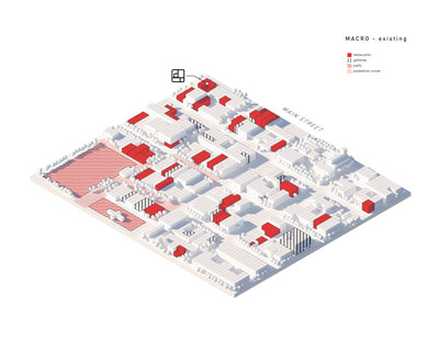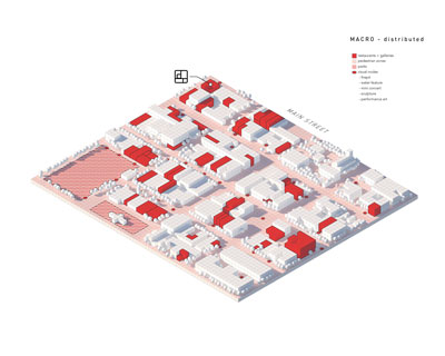 • Macro – Focused on the 16 block grid of a “resort town” that currently contains nearly 30 restaurants, we have marked locations where people can disperse at 6 FT modules with their take-out food throughout visual nodes such as fire pits, water features, music and art presentations, and use of galleries for enjoying meals.